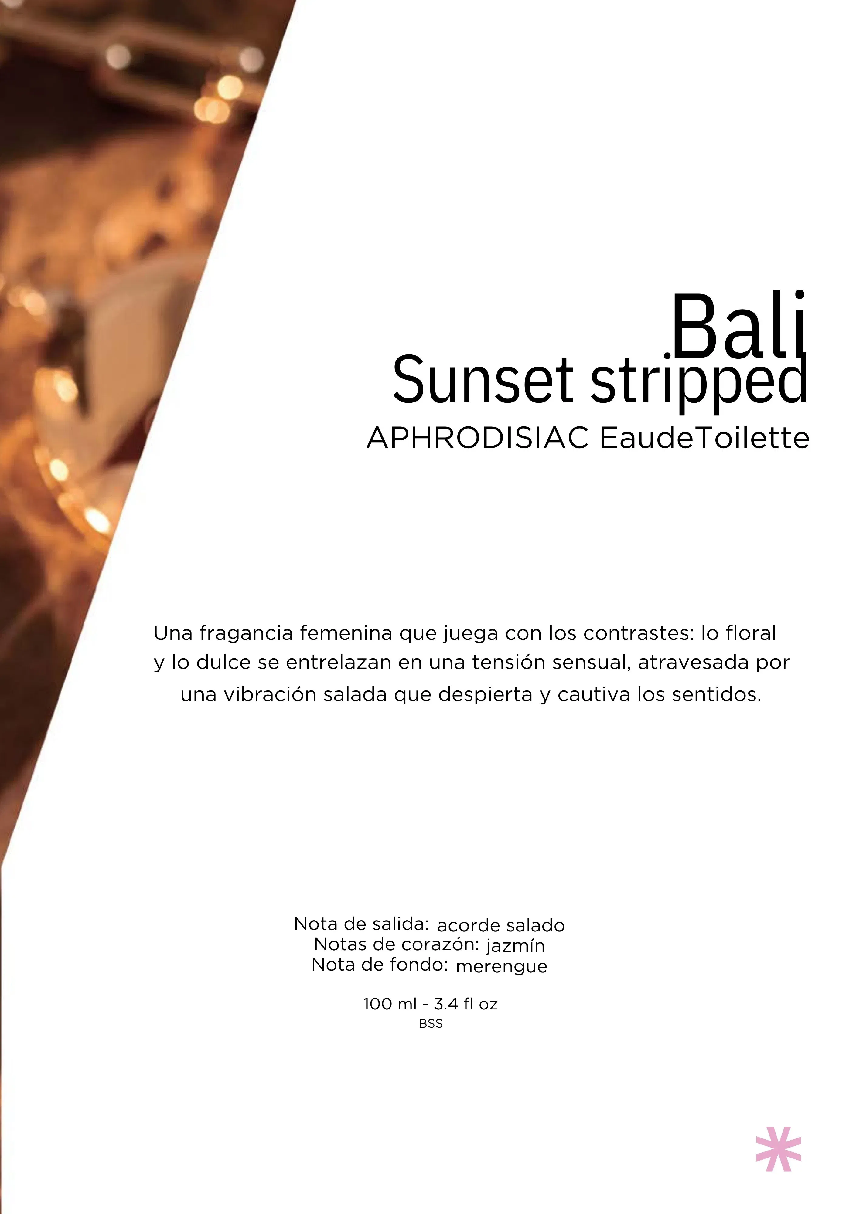 Déjate envolver por la tensión fluida entre lo floral y lo dulce, atravesada por una sutil vibración salada. BALI Sunset Stripped captura la esencia de un atardecer tropical con una combinación envolvente de notas saladas en la salida, un corazón de jazmín sensual y un fondo de merengue irresistible.